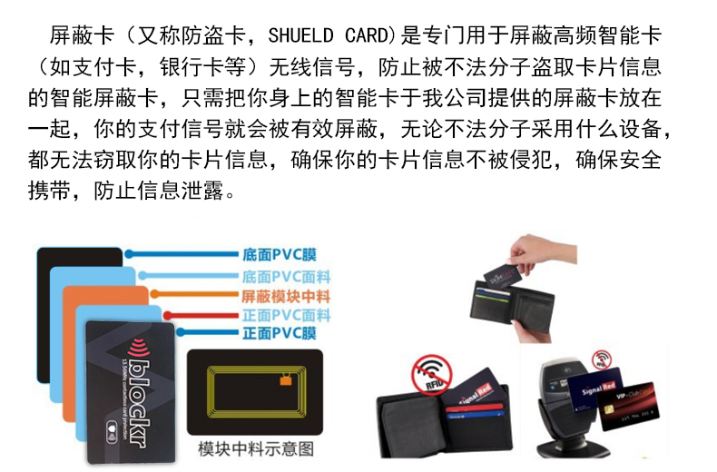 專業(yè)生產(chǎn)銷售IC卡,CPU卡,價(jià)格合理,質(zhì)理保證,價(jià)格實(shí)惠,歡迎來電咨詢。免費(fèi)提供設(shè)計(jì),支持深度定制,商家企業(yè)卡片產(chǎn)品定制的福音。融智興NFC屏蔽卡銀行卡信用卡防盜刷防掃描 RFID Blocking card,具有防止掃描、防止消磁,防止盜刷,防卡讀取的特點(diǎn),保障您的用卡安全!