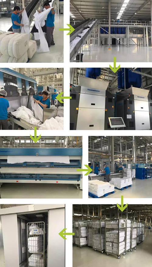 人工將布草分揀后放入傳送帶中,布草會(huì)隨著傳送帶被傳送到吊帶中,吊帶將臟布草掉進(jìn)洗衣主龍中,進(jìn)行清洗。經(jīng)過(guò)烘干后的干凈布草會(huì)被裝進(jìn)白色的吊帶中,經(jīng)機(jī)器折疊后人工運(yùn)送到整理區(qū)。
